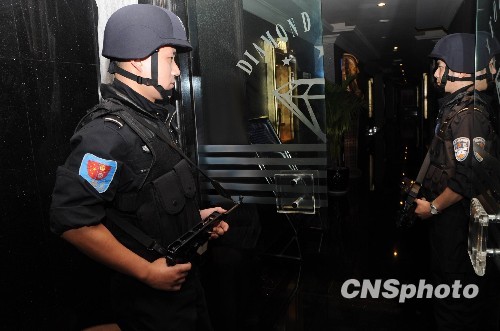 重慶希爾頓酒店因股東涉黑,介紹、容留婦女賣淫,違法經營和故意擾亂社會秩序,于6月20日被當地警方責令停業整頓。圖為警方清查該酒店內一夜總會。 中新社發 渝公安 攝