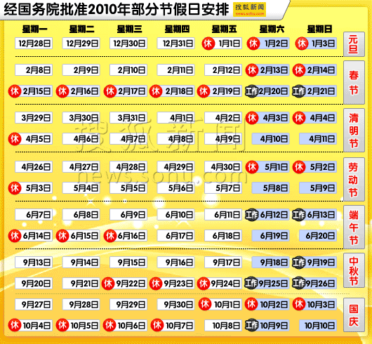 2010年七大節日休假示意 搜狐新聞制圖