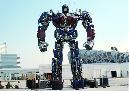 圖為10米高的變形金剛矗立在鳥巢北側(cè) 攝/記者孫靜