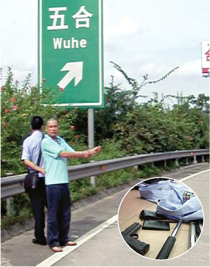 嫌疑人指認當初攔截莫氏兄弟汽車的作案現場。小圖:嫌疑人作案用的警服和仿真槍等工具 青秀公安分局供圖