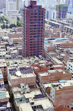 在西安市南郊電子城一個被稱作“北山門村”的城中村里,一座赭紅色的23層高樓煞是耀眼。它修建3年來如今眼看就要竣工了,當地的相關部門對此仍視而不見,無人過問,沒有任何報批手續,成了真正意義上的“監管真空”。該樓被當地媒體爆炒為“史上最牛的農民大廈”,也有人稱它為“史上最高的違章建筑”。