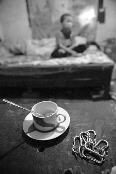 成都武侯區簇橋街道馬家河村8組28號,10歲的小浩正坐在租住房的床上看電視。他的腳踝上拴著一條指頭粗細的鐵鏈,鏈子的另一頭繞出房門,拴在院子里的一根廢棄的鐵柱子上。