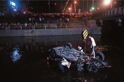 救援者打撈墜河保時(shí)捷,現(xiàn)場(chǎng)圍觀者有上百人。圖/記者張沫