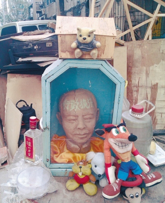 在沈陽(yáng)華山路和長(zhǎng)江街路口附近,有一條不起眼兒的小巷。在巷子里有一個(gè)白色的電話(huà)亭,從外面看,這個(gè)電話(huà)亭和其他電話(huà)亭并無(wú)二致,一樣的裝飾,一樣賣(mài)著香煙和飲料。不過(guò),電話(huà)亭里面卻有一個(gè)很不一般的“物件兒”:一尊用黃泥捏成的人頭塑像。幾天前,記者親眼目睹了這尊塑像的風(fēng)采,應(yīng)該說(shuō),泥像捏得非常傳神,在寬寬的額頭上還有4個(gè)字,表明了它的特別之處:行政執(zhí)法。