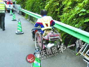 原來,10日晨8時15分左右,一名司機向六大隊報警說,臨近渝黔高速公路東溪段往貴州方向的天平丘隧道,他發現所有車突然慢下來——原來,路上有個穿反光背心的殘疾中年男子,正吃力駕駛1輛手搖三輪車緩行。駛入緩上坡不久,男子累得滿頭大汗,索性下車手撐三輪車尾,用幾乎半跪半爬方式推車。