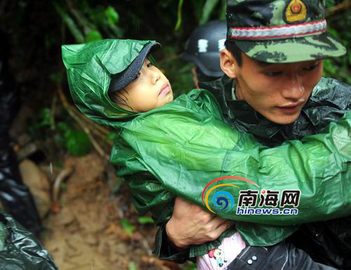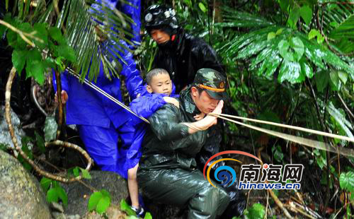 武警救援人員將一名小孩抱下山。(南海網(wǎng)記者汪德芬攝)