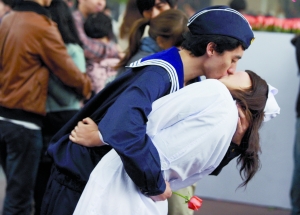 活動開始后,分四個區域排好隊的情侶們開始接吻。一名男子穿著藍色水兵服,女孩身穿護士服,“水兵”輕攬“護士”腰際,“護士”閉目上身傾倒,原來,他們在模仿著名的“世紀之吻”。