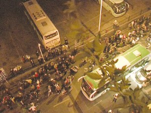 當晚5點40分,交警三大隊的李教導員在巡查晚高峰車流狀況時發現,應天大街高架中華門長途汽車站路段的高架橋欄桿外側,一名年齡30歲左右的長發女子坐在那里,看上去是想不開要跳橋,離女子不遠的身后,一名男子跪在橋面上,操著外地口音請求女子下來,但是女子并不理睬,此時情況十分危急,女子懸在橋欄外,身下不但是堅硬的路面,而且車來車往。李教導員于是上前勸說,并立即通知110前來處理,很快110及中華門派出所民警都到場!坝惺裁聪氩婚_的,下來慢慢說,坐在橋欄外面多危險啊,稍有閃失就粉身碎骨,不值得啊!痹诂F場的民警勸她,但女子一言不發。這時,橋下汽車站附近聚集了不少群眾,大家紛紛仰望橋面上的動靜。一輛消防車開到橋下,在勸說無果的情況下,消防員迅速在女子的正下方鋪設了一張鼓鼓的氣墊,準備采取強制營救。