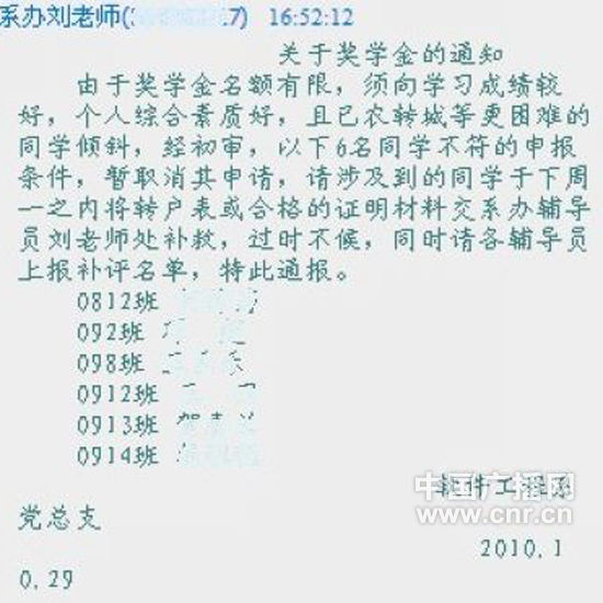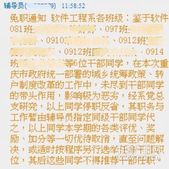 重慶科技學(xué)院一學(xué)生表示,從今年9月份開(kāi)學(xué)起,他所在的班級(jí)輔導(dǎo)員就開(kāi)始頻繁與農(nóng)村戶口的大學(xué)生“交流”,其中9月份的“交流”就達(dá)4次,相當(dāng)于他所在班級(jí)上一學(xué)年所開(kāi)班會(huì)次數(shù)的總和。