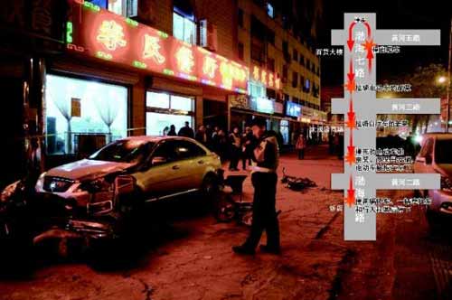 在黃河三路以南的大觀園商場附近,劉某又將騎自行車的女子姜某撞傷。在繼續(xù)向南逃竄的過程中,劉某將騎乘電動車的賈某、商某母女倆撞飛,轎車拖著電動車向南行至黃河二路以南時,又撞上兩輛轎車及一輛摩托車,最后停在一家飯店門口,其間還將路邊的行人程某撞傷。