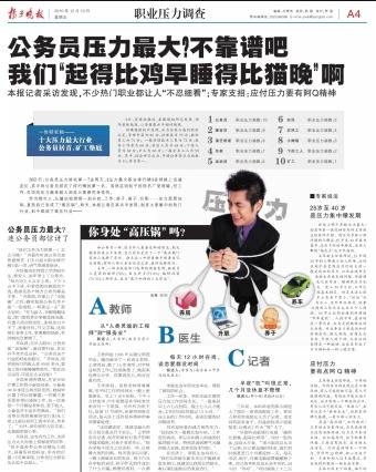 “我們工作壓力排第一?怎么可能?”齊磊在聽說公務員竟然被排在《壓力最大職業排行榜》第一時,語氣里滿是驚訝。