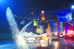 16日凌晨,九江長江大橋養護人員在除雪融冰保暢通。當日凌晨,受強降雪影響,江西九江長江大橋橋面被厚厚的冰層覆蓋,排隊等候過橋的車輛長達數十公里。洪顯智攝(資料圖)