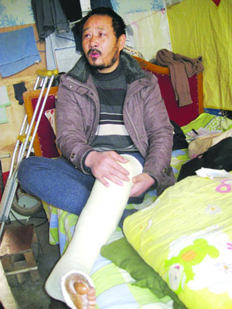 “診斷為脛腓骨下端粉碎性骨折,身上沒有多少錢,只是掛了兩天水,上了石膏,只能回家休養了。”張峰說,最開始時,連飯都吃不了,都是好心的鄰居幫了他一把。在陷入困境時,他找到當地的紅花街道,民政辦了解到他沒有戶口,但仍然為其送上了1500塊錢的補助。當地的紅十會也送來了4000塊錢。