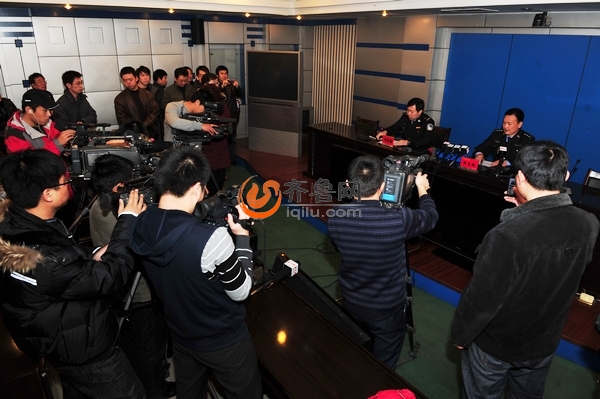 2011年1月5日,泰安市公安局召開第二次新聞發布會通報了1.04持槍殺人案犧牲民警及有關人員基本情況。圖為發布會現場。(攝影 張曉博)