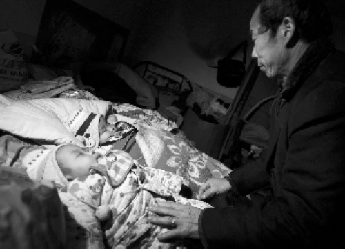 老人撫摸一對龍鳳胎孫子孫女。因妻子生產后身亡,孫雪峰將兩家醫院告上法庭。昨日,該案進行了鑒定質證。記者 吳江 攝