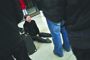 昨日,北京西站,一名女子因為誤了火車,還和同行的丈夫走散,無助地坐在地上哭。本報記者 李強 攝
