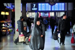 昨日,一名男子扛著比他的頭高不少的大提琴進入北京西站。本報記者 李強 攝