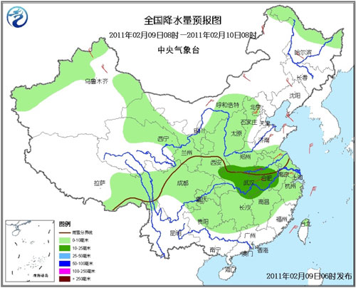 9日08時至10日08時,,新疆北部和西部、青藏高原北部和東部、西北地區中東部、內蒙古中部、黑龍江北部、華北中西部、黃淮西部、江淮、江漢、江南、西南地區東部、廣西東北部等地有小到中雪(雨)或雨夾雪,其中,安徽中北部、河南中南部的局部地區有大雪。新疆北部、內蒙古東部、東北、黃淮東部有4~6級偏北風。渤海、黃海、東海、臺灣海峽等海域將有5~7級、陣風8~9級偏北風。