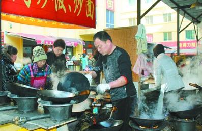 剛剛走進三好美食街的大門,就能聽見丁丁當當的有節奏的勺子摩擦大勺的炒菜聲,夾雜著偶爾出現的叫好聲。大勺哥鄭建安被圍在長長的排隊人群內,透過人群,只見12個爐灶圍著他并排擺成一圈,一個個爐灶擺上大勺緊緊挨著。
