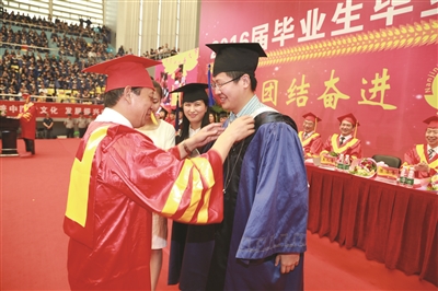 蔣日磊和李倩是南中醫中醫學(中西醫結合)七年制的畢業生,兩人在南中醫校園相遇,一起走過本科到研究生的七年;在領取畢業證書之前,又一起接到了南中醫的博士學位錄取通知書。在畢業典禮上,南京中醫藥大學胡剛校長親手把滿載著祝福的畢業禮物——寓意著幸福的格;ǚN送給了他們,還親自為他們戴上了刻有學校;、校名、兩人姓名和學號的戒指。胡校長說,希望他們帶著全校師生的祝福,將愛、幸福和希望播向四方。同時,胡剛校長也寄語2016屆全體畢業生,愿他們在未來的人生中“望聞問切闖世界,配伍人生繡華章”。