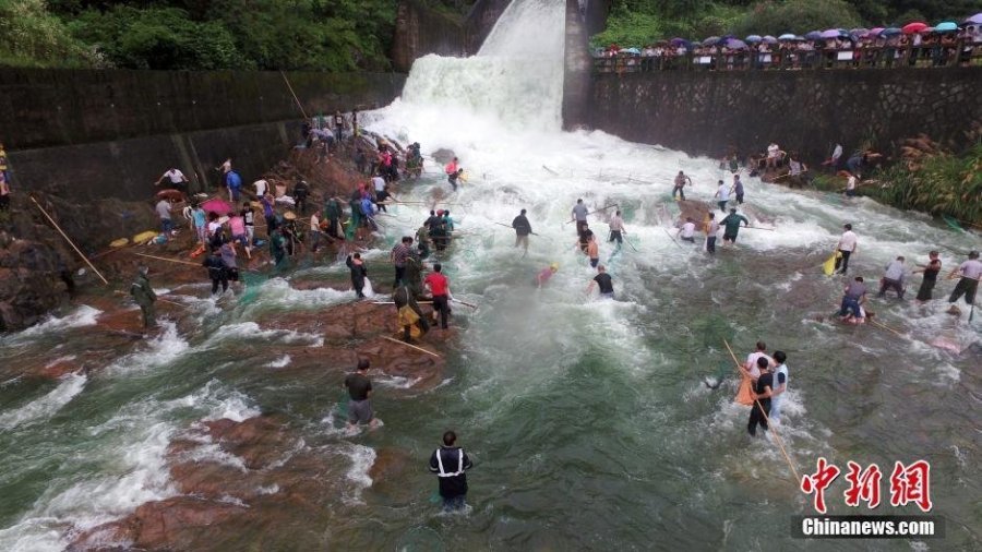 6月29日,位于浙江省衢州市衢江區杜澤鎮的銅山源水庫泄洪,大批市民涌入泄洪口,冒險捕撈水庫沖出來的魚兒。 (來自:中新網)