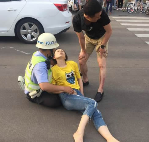 那天,像往常一樣,江蘇省宿遷市交警二大隊(duì)一中隊(duì)的民警張亮亮在轄區(qū)巡邏時(shí),看到一黑衣男子癱坐在地上,腿上流了好多血,身旁還躺著一名黃衣女子,鞋子已被撞飛,看上去好像沒什么外傷。一輛電動(dòng)車歪倒在地,旁邊停放著一輛SUV。張亮亮意識(shí)到,這應(yīng)該是一起剛剛發(fā)生的交通事故。