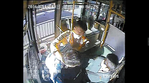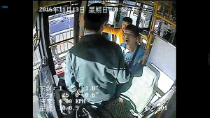 從車內監控來看,沖上車的男子一人身穿藍色衣服,一人穿黃色衣服。藍衣男子在前跑,黃衣男子在后面追。8點52分,藍衣男子直接沖到司機旁邊,死死抱住方向盤,嘴里叫著:“有人打我,有人打我。”而黃衣男子緊隨而至,不停扭打藍衣男子,并且說藍衣男子是“小偷”。