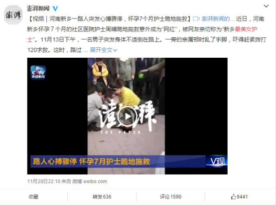 近日,河南新鄉懷孕7個月的社區醫院護士周晴跪地施救意外成為“網紅”,被網友親切稱為“新鄉最美女護士”。11月13日下午,一名男子突發身體不適倒在路上。這時,路過的周晴毫不顧忌自己懷有身孕的情況,立即對昏迷男子實施急救。由于做心肺復蘇術只有雙臂垂直用力,才能使上勁,周晴不得不挺著肚子跪地施救。30秒后,男子蘇醒過來。120救護車趕到后,急救醫生確認男子已脫離生命危險。醫生表示,病人剛才是心搏驟停,如果不是周晴及時對病人施行了心臟復蘇術,病人就有可能失去寶貴的生命。
