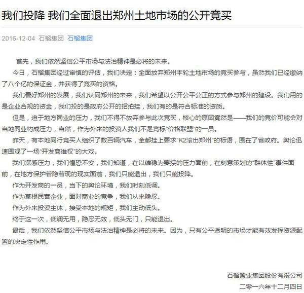 12月4日凌晨3時29分,石榴集團(tuán)微信公眾號發(fā)出這樣一則消息,“我們投降,我們?nèi)嫱顺鲟嵵萃恋厥袌龅墓_競買”。