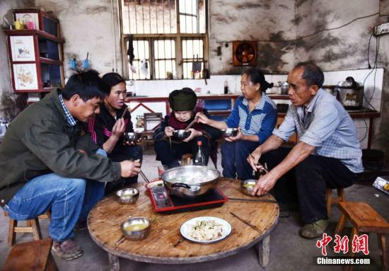 在“中國長壽之鄉(xiāng)”廣西桂林市恭城瑤族自治縣西嶺鄉(xiāng)嶺腳村,居住著目前桂林市年齡最大的長壽老人——114歲的王玉瓊。12月8日,記者探訪了這位百余歲長壽老人的生活。老人與人交談思維清晰,說話流利,還堅(jiān)持每天自己打水洗澡、洗臉,自己打水洗衣服,生活自理,老人也一直有抽煙喝酒的習(xí)慣。圖為12月8日,王玉瓊與家人一起吃午餐。唐夢憲 攝