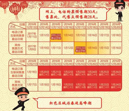 中國鐵路總公司在上述《方案》中也明確,春運圖定旅客列車和增開旅客列車的車票均于2016年12月15日開始發(fā)售。