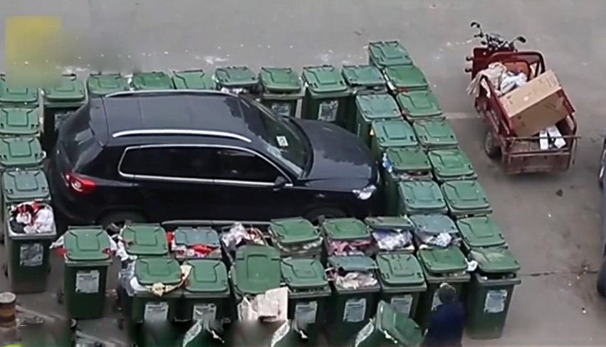 近日,合肥市一小區(qū)門外,有私家車停在了居民生活垃圾臨時停放點,因無法聯(lián)系上車主,環(huán)衛(wèi)大爺用垃圾桶圍起這輛亂停的車。