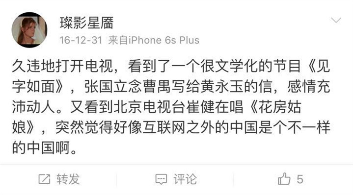 “有質感”,“有內涵”,“錘擊內心”,“第一次看到這樣新穎的節目”,“絕對是2016年最后的驚喜”,“今年最值得傳播的節目”,“在2016年最好的、最有意義的一檔節目”……網友如此評價《見字如面》,并稱這是一檔能夠給人帶來靜謐的節目,“可以讓人思考、自修“,并讓人“突然覺得好像互聯網之外的中國是個不一樣的中國啊”。