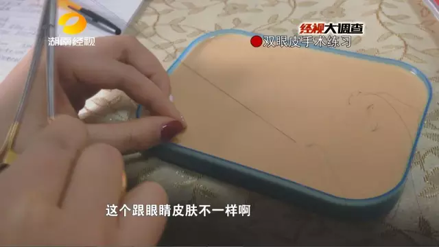 第一天上課劉老師講了雙眼皮的理論知識(shí),并聲稱眼部手術(shù)任何醫(yī)生都可以做,然而才過(guò)了半個(gè)小時(shí),老師便講完了雙眼手術(shù)的所有理論知識(shí)。隨后,她給學(xué)員發(fā)了一個(gè)練習(xí)皮,讓學(xué)員在上面練習(xí)。