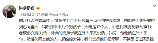 麗江打人搶劫事件:2016年11月11日凌晨三點(diǎn)半到寧蒗燒烤,由燒烤店老板安排到包間里面,稍后到來(lái)十幾個(gè)男孩子,大概是12個(gè)人,中途我跟朋友聊天(客棧老板)說(shuō)的東北話,外面的男孩子就在外面學(xué)我說(shuō)話,我說(shuō)一句他就在外面學(xué)一句,然后伙同其他的人一起哈哈大笑,我們覺(jué)得他們很無(wú)聊,不管是搭訕還是挑釁的意思,我們沒(méi)有理會(huì),繼續(xù)吃烤聊天,隔一會(huì)對(duì)方又開(kāi)始學(xué)我們說(shuō)話,這一次學(xué)完我們說(shuō)話還辱罵我們,之后我們就問(wèn)他什么意思,是不是喝多了酒,起初他們還沒(méi)有回復(fù),之后我們就各自吃烤肉了,其中有個(gè)穿藍(lán)色馬甲的中年男人,到我們我們間的門口打量我們包間,我們就不知道什么意思,我們還是繼續(xù)吃烤肉,之后他們就拿起酒瓶子進(jìn)我們的包間,把酒瓶子砸到我們頭上,我們當(dāng)時(shí)就是暈的,之后我就被那三四個(gè)男人拉著頭發(fā)給拖到燒烤店的門口外面,一頓暴打,一邊錄視頻一邊打,之后覺(jué)得錄視頻的效果不好,又扯著我的頭發(fā)面朝天的樣子,繼續(xù)錄視頻暴打我,一邊打一邊還說(shuō):你不是東北人?你不是很牛逼嗎?然后就哈哈大笑,把我打得滿臉都是血,還在拿碎掉的酒瓶子劃我的臉,之后他們?nèi)コ闊熜菹⒘,在我流血的過(guò)程,他們要求我按照他們說(shuō)的話去說(shuō),不然就把我拖到山上去給埋了,威脅我的內(nèi)容是:小妹妹,你是不是自己從樓上掉下來(lái)摔成這樣的啊?要不要哥哥們幫你打120啊?要不要哥哥們救你?我們看你好可憐啊。我學(xué)著他們的話去說(shuō),這個(gè)過(guò)程他們是全程錄視頻的,反偵察的能力很強(qiáng),說(shuō)完之后就繼續(xù)打我,又了打了一頓,最后這次打完我,臨走之前有個(gè)狠狠地踢我一腳。我直接噴血了。這一腳我直接不行啦,上不來(lái)氣了,他們走之前丟給我手機(jī),讓我自己打120 ,這是看我不行了,快死掉了,走的時(shí)候拿走我們身上帶的錢,錢包和手機(jī),三個(gè)被打得人,只留了我這一部手機(jī),還是看我不行了,給我打電話自救的,我們?nèi)齻(gè)人被足足打了半個(gè)小時(shí),他們臨走之前還揚(yáng)言說(shuō):他們就是當(dāng)?shù)厝恕⒉慌戮、隨便告、還說(shuō)在麗江在看到我、讓我有去無(wú)回....120是早上6:30左右來(lái)的,這期間我一直在流血,我打120的時(shí)候,我不知道燒烤店的名字,我問(wèn)燒烤店的老板,他說(shuō)完以后我就昏迷了,我們?cè)谶@個(gè)燒烤店被打這么久,燒烤店的老板沒(méi)有報(bào)警和打120,就眼睜睜的看著我們被打,后來(lái)警方得知這個(gè)燒烤店和那其中的一個(gè)人是認(rèn)識(shí)的,他們走的時(shí)候開(kāi)著一輛白色的轎車走的。