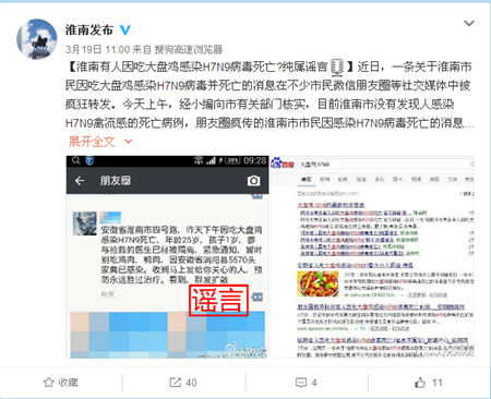連日來(lái),微博、微信朋友圈有消息稱:“淮南一市民昨天下午因吃大盤雞感染H7N9死亡,25歲,孩子1歲,參與搶救的醫(yī)生已被隔離,緊急通知,暫時(shí)別吃雞肉鴨肉。因安徽渦陽(yáng)縣5570頭家禽已感染。收到馬上發(fā)給你關(guān)心的人,預(yù)防永遠(yuǎn)勝過(guò)治療。看到,群發(fā)擴(kuò)散。”19日,安徽省淮南市人民政府通過(guò)官方微博辟謠稱:“目前淮南市沒(méi)有發(fā)現(xiàn)人感染H7N9禽流感的死亡病例,朋友圈瘋傳的淮南市市民因感染H7N9病毒死亡的消息為假消息。