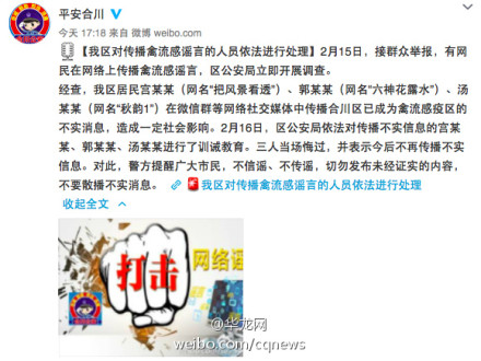 重慶合川3網(wǎng)民傳播禽流感謠言,被警方依法進(jìn)行處理。重慶市合川區(qū)公安局官方微博@平安合川 發(fā)布通報(bào),2月15日,接群眾舉報(bào),有網(wǎng)民在網(wǎng)絡(luò)上傳播禽流感謠言,合川區(qū)公安局立即開(kāi)展調(diào)查。經(jīng)查,合川區(qū)居民宮某某(網(wǎng)名“把風(fēng)景看透”)、郭某某(網(wǎng)名“六神花露水”)、湯某某(網(wǎng)名“秋韻1”)在微信群等網(wǎng)絡(luò)社交媒體中傳播合川區(qū)已成為禽流感疫區(qū)的不實(shí)消息,造成一定社會(huì)影響。