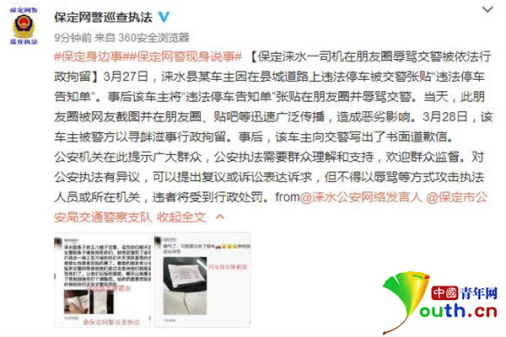原標(biāo)題:河北保定一司機(jī)違停受處罰后發(fā)朋友圈詛咒侮辱交警被行拘
