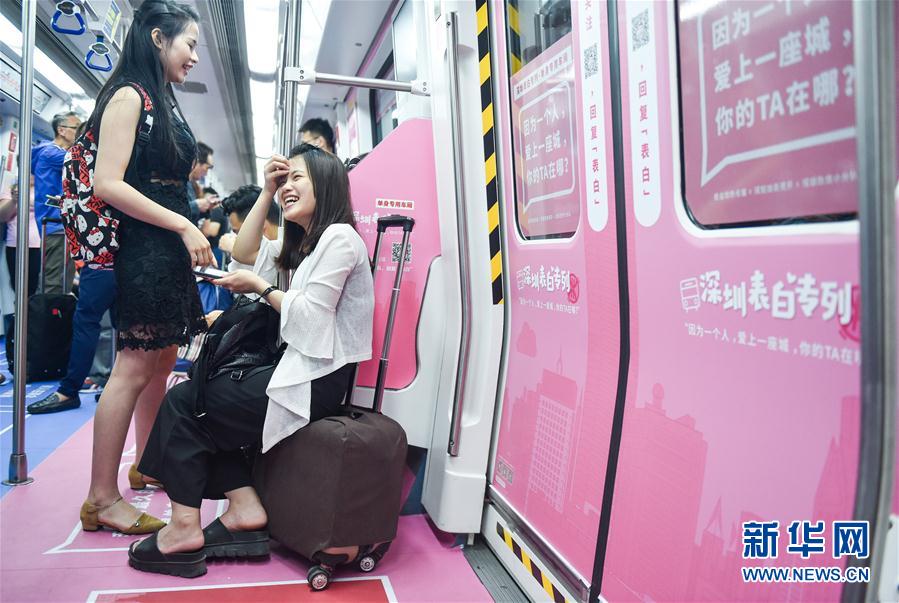 5月8日,乘客搭乘深圳地鐵“表白專列”。當日,廣東深圳地鐵“表白專列”正式運營。這趟列車將運行1個月,每天在地鐵1號線上巡回行駛。列車車廂被裝飾成粉色系,印上了從網友上千條投稿中精選的表白文字。新華社記者 毛思倩 攝