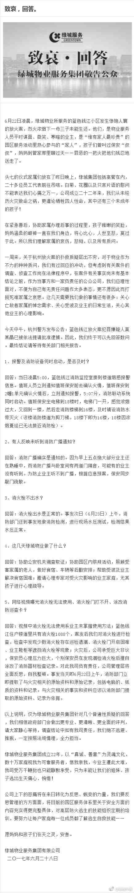 人民網北京6月29日電 杭州"保姆縱火致4死案"近日備受關注。針對火災發生后有住戶質疑小區的消防設備存在問題,涉事的綠城物業今日凌晨在其官方微博回應表示,凌晨5時小區物業監控室接到樓道煙感報警信息,7分鐘后消防聯動系統同時啟動,消防廣播也有通知。此外,綠城物業承認,火災后個別保安員在發現漏檢消火栓后擅自涂改了消防器材檢查記錄。