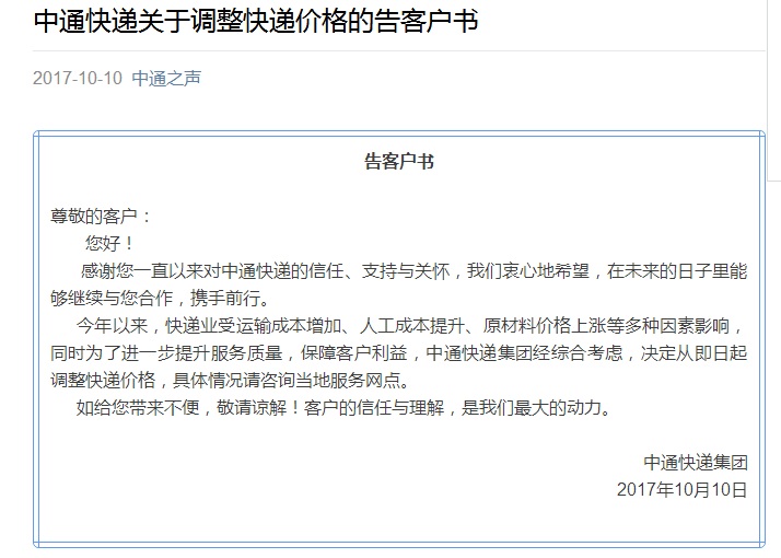 人民網北京10月11日電 (易瀟)中通快遞集團官方微信號“中通之聲”10日發布《中通快遞關于調整快遞價格的告客戶書》稱,即日起調整快遞價格,具體情況請咨詢當地服務網點。