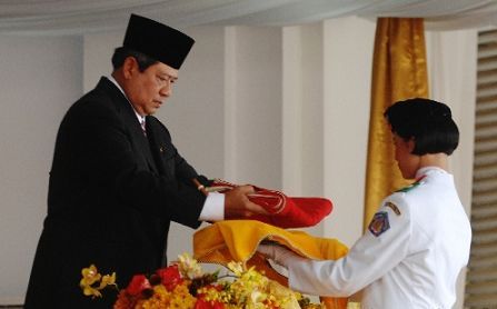 中新網8月20日電 綜合報道,印度尼西亞17日在首都雅加達舉行獨立日慶典,印尼總統蘇西洛將國旗遞給一名旗手,由儀仗隊員升起印尼國旗。此外,印尼當天還舉行多種慶典活動,慶祝獨立63周年。