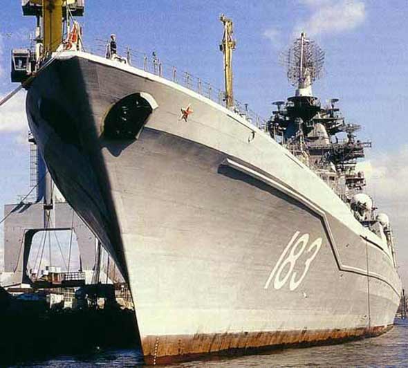 “基洛夫”級戰(zhàn)列巡洋艦船體修長,表面設(shè)施簡潔,一反俄軍水面艦只傳統(tǒng)特征(資料圖片)