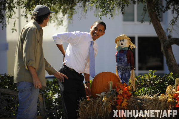 30日,在美國佛羅里達州的薩拉索塔,選戰中四處奔走的美國民主黨總統候選人奧巴馬忙里偷閑,來到當地的一家南瓜園摘南瓜,享受片刻悠閑。 新華社/法新