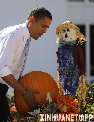 10月30日,在美國佛羅里達州的薩拉索塔,選戰中四處奔走的美國民主黨總統候選人奧巴馬忙里偷閑,來到當地的一家南瓜園摘南瓜,享受片刻悠閑。 新華社/法新 |
