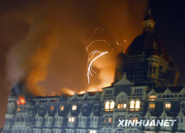 11月27日,印度孟買的泰姬瑪哈酒店遭恐怖襲擊后發生火災。26日晚間到27日凌晨,印度孟買市中心的火車站、酒店和市政府等多處建筑遭到武裝分子的襲擊,目前已造成至少80人死亡、250多人受傷。 新華社/美聯