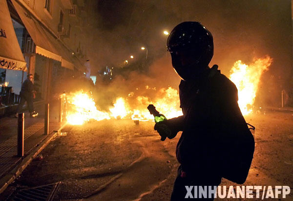 12月8日,一名示威者在希臘首都雅典的一個著火現場抗議。雅典市中心地區的騷亂爆發于6日晚,起因是警察打死一名15歲少年。目前騷亂仍在繼續。 新華社/法新