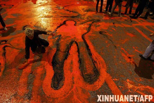 12月8日,在希臘首都雅典,示威者在地上涂抹紅色和黑色,象征死者和鮮血。雅典市中心地區的騷亂爆發于6日晚,起因是警察打死一名15歲少年。目前騷亂仍在繼續。 新華社/法新