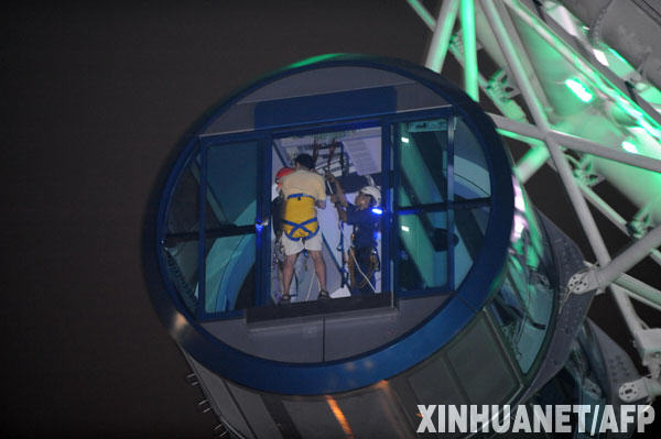 12月23日,工作人員用繩索轉移一名被困在新加坡摩天觀景輪座艙中的游客。有世界最高摩天觀景輪之稱的“新加坡飛行者”當日發生技術故障,100多名游客被困于高空6小時。 新華社/法新