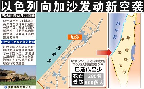 以軍27日中午開始對加沙地帶發動了幾十年來規模最大的空襲行動。截至28日,空襲已造成約300人死亡、1000多人受傷。